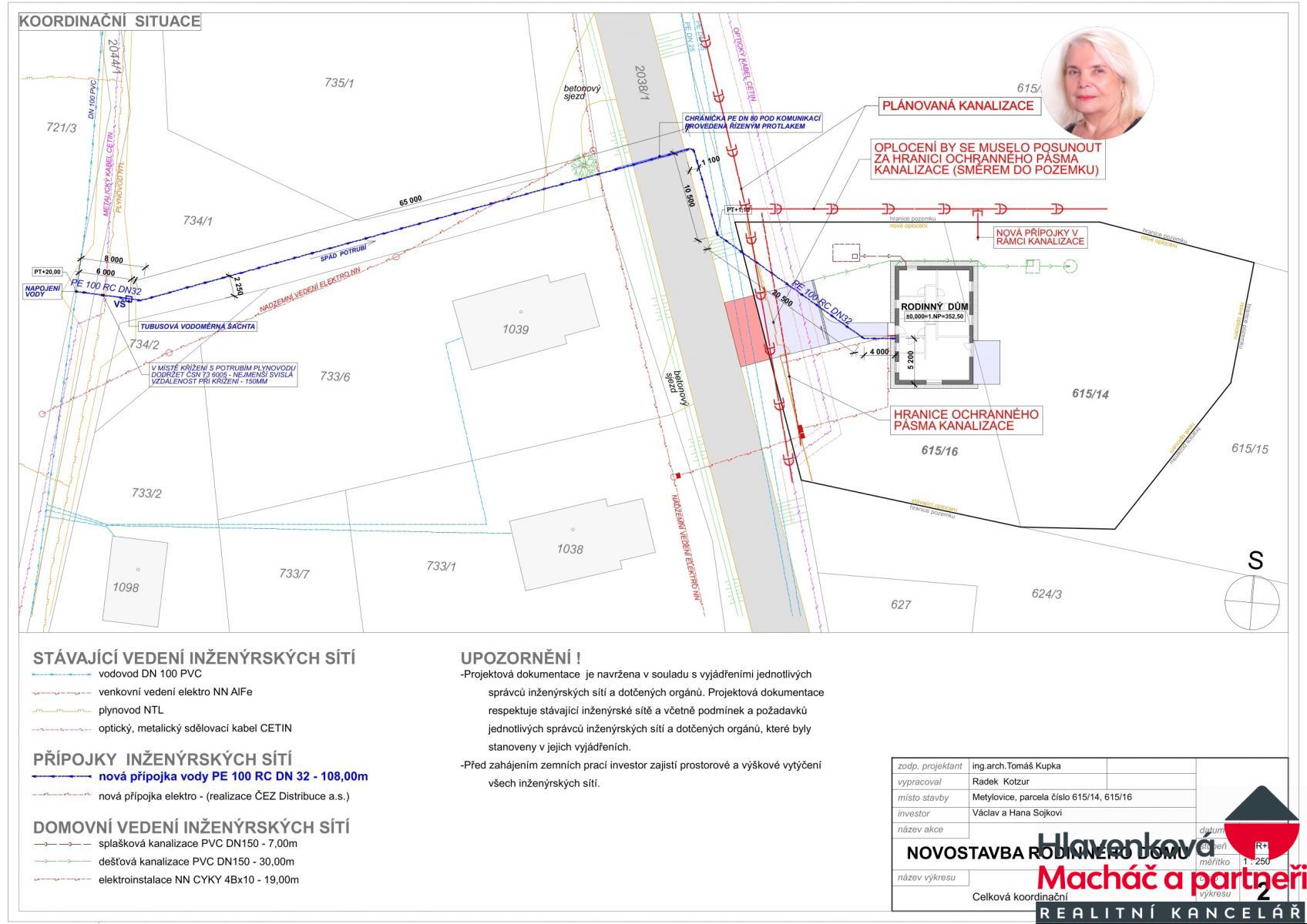 – kanalizace na hranici pozemku (viz plánek)